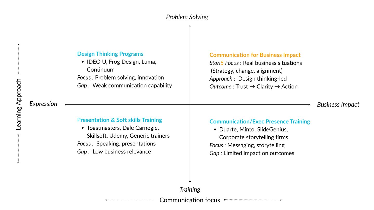 Stori5 is Leadership Capability Development company that sits at the intersection of Leadership Communication - Design Thinking - Business Impact. We enable leaders to use a Design Thinking driven approach and turn conversations into moments that create Trust, Clarity and Action.