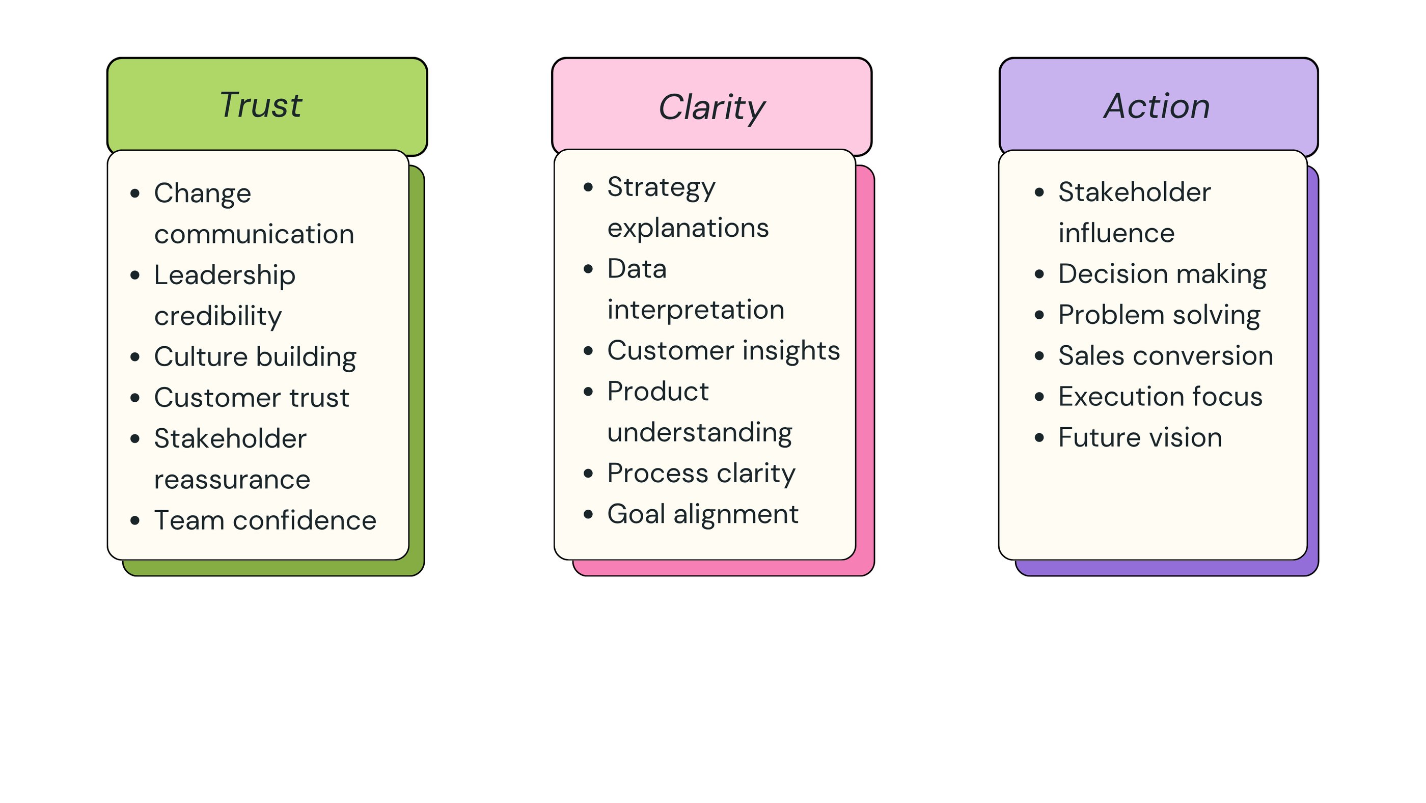 At Stori5, Leadership Communication is designed to create outcomes, not just deliver messages. Our framework helps leaders - build Trust, bring Clarity and drive Action in real business situations.